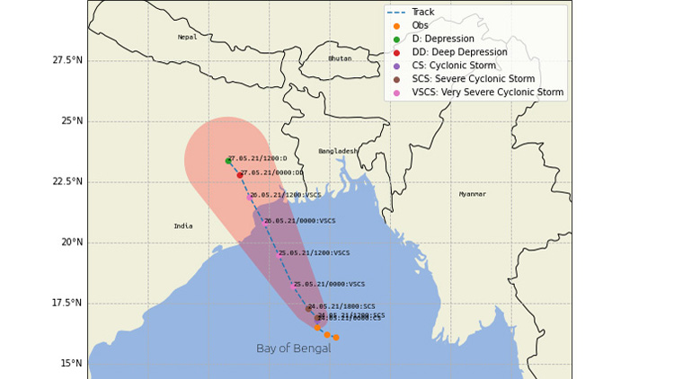 ঘূর্ণিঝড় ইয়াসের গতিপথের চিত্র প্রকাশ করেছে বাংলাদেশ আবহাওয়া অধিদফতর। সেখানে দেখা গেছে ২৫ মে মঙ্গলবার, ইয়াস প্রবল ঘূর্ণিঝড়ের রূপ নেবে। এদিনই এটি অতিপ্রবল ঘূর্ণিঝড়ে রূপ নেবে। অতিপ্রবল ঘূর্ণিঝড় আকারেই বুধবার ভোরে ইয়াসের চোখ বা কেন্দ্রটি ভারতের উপকূলের কাছে যাবে এবং স্থলভাগে উঠবে। বুধবার সারাদিন তাণ্ডব চালিয়ে এ দিন শেষভাগে এটি প্রবল ঘূর্ণিঝড়ে রূপ নেবে। এরপর বৃহস্পতিবারের শুরুর দিকে ঘূর্ণিঝড় থেকে এটি গভীর নিম্নচাপে রূপ নেবে। বৃহস্পতিবার শেষ দিকে এটি নিম্নচাপে পরিণত হবে।