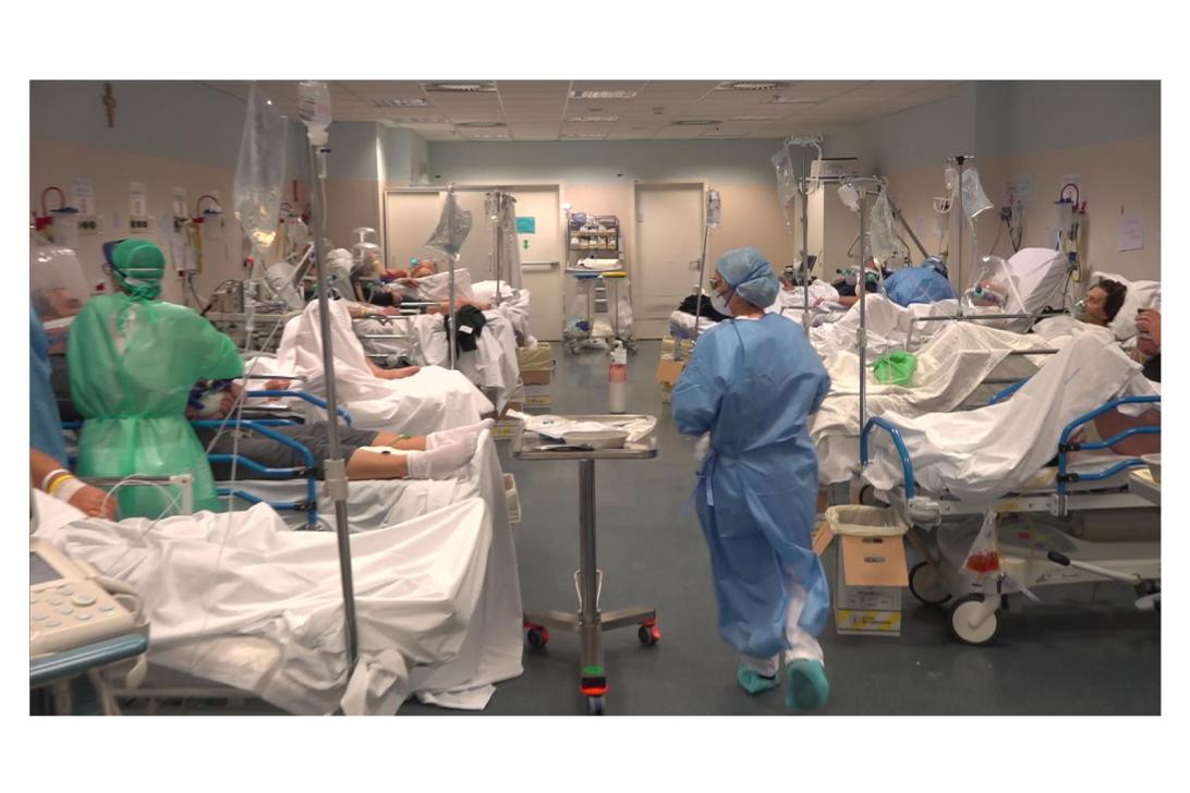 বিপুল যন্ত্রপাতি ও কর্মীদের উদ্বেগ দেখে মনে হয় এটা যেন কোনো নিবিড় পরিচর্যা কেন্দ্র (আইসিইউ), কিন্তু এটা একটা জরুরি বিভাগের প্রবেশ পথ। আইসিইউতে কোনো জায়গা নেই। শারীরিক অবস্থা প্রচণ্ড খারাপ হওয়া সত্ত্বেও নতুন আসা রোগীদেরকে বাইরেই রাখতে হচ্ছে।